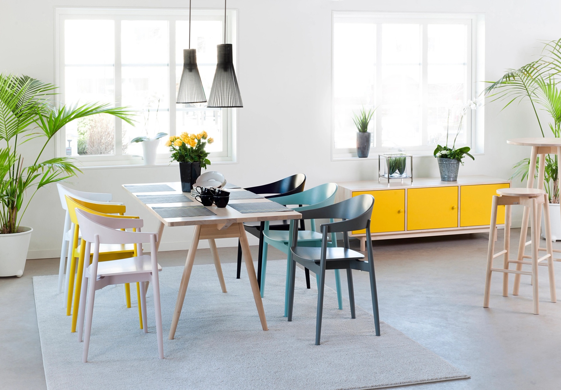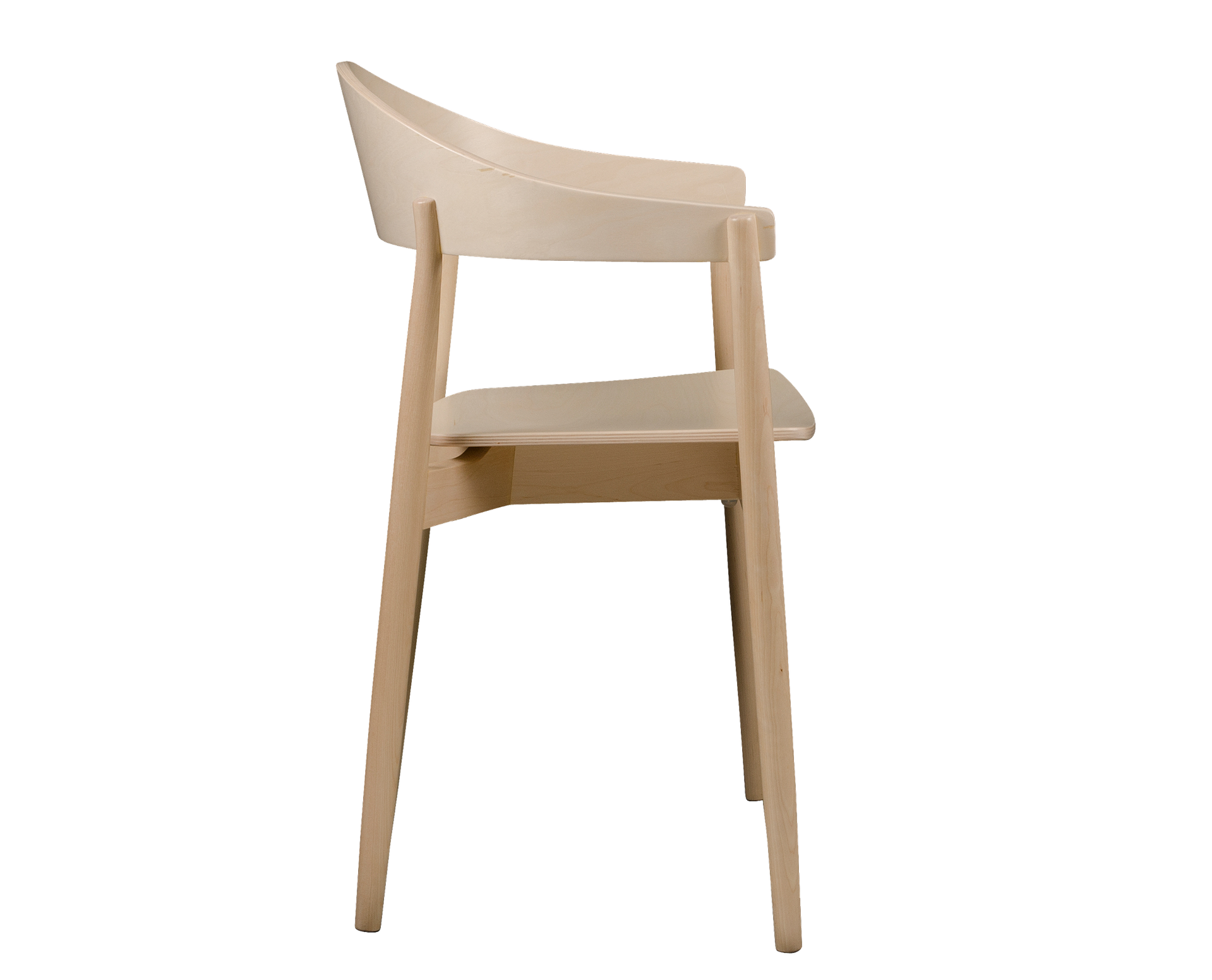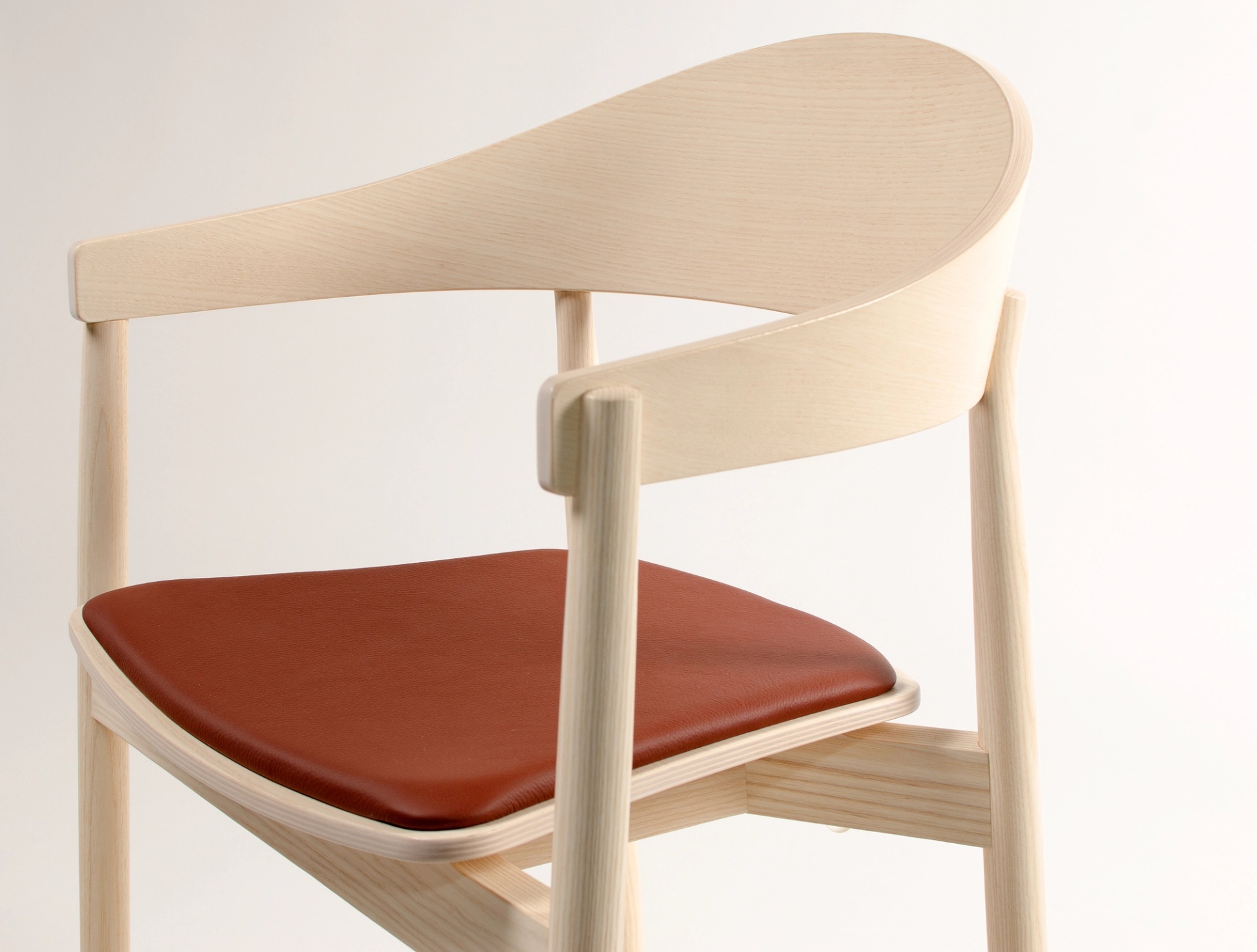 Stolen är tillverkad i massiv björk eller ask med formpressad rygg och sits, och finns både med träsits och klädd sits i tyg, läder eller konstläder.