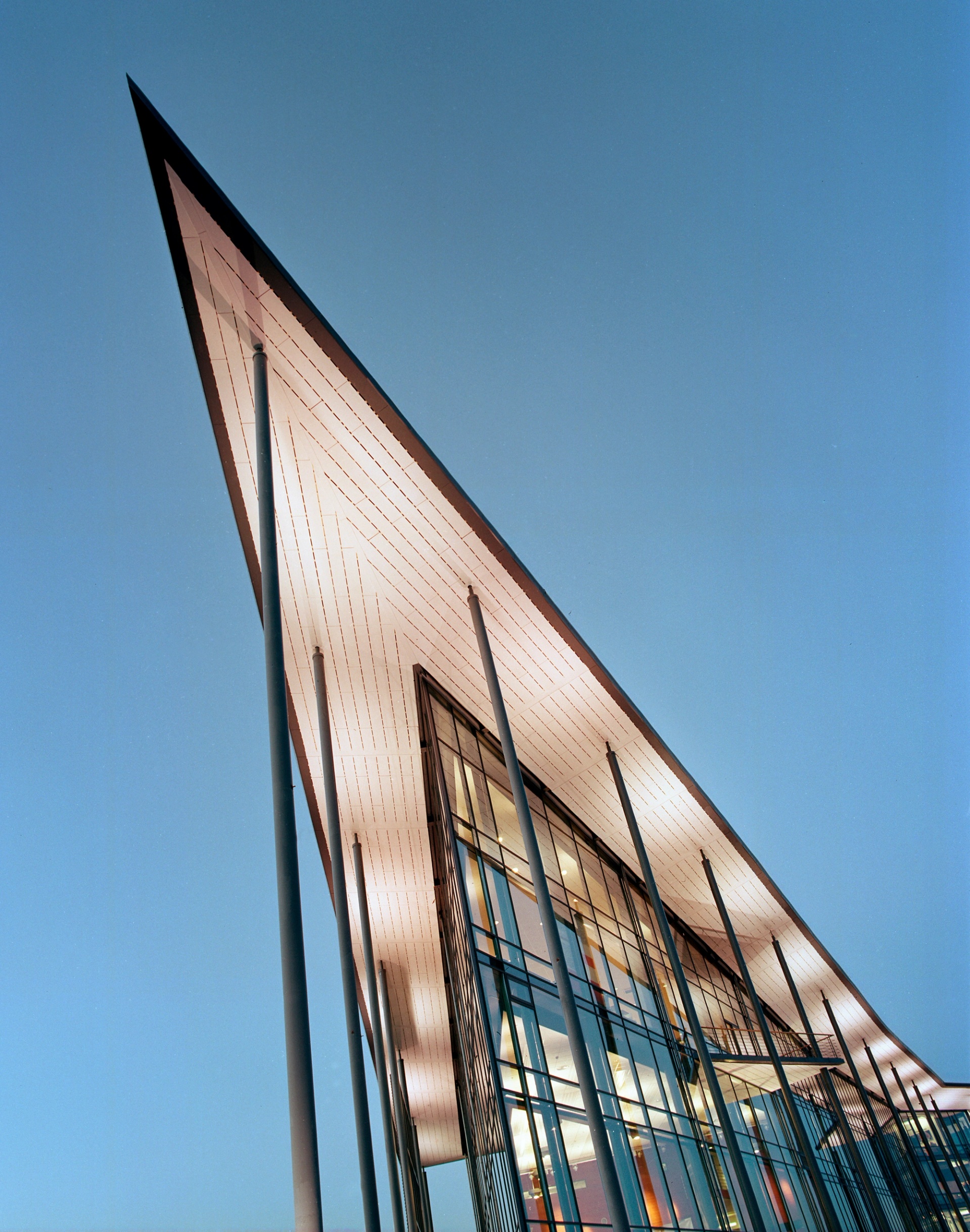 En utmaning med tomten var att definiera husets framsida. Läget med en långsida längs kajen innebar ett behov av en artikulerad frontfasad mot vattnet och mot staden på andra sidan älven. Samtidigt måste entrén vändas mot andra sidan, eftersom det är från denna sida man når byggnaden, oavsett om man kommer med bil, cykel eller kollektivtrafik. För att möta de båda framsidorna har den lägre och mera slutna byggnadskroppen skjutits lite åt sidan, samtidigt som glasbyggnaden dragits fram förbi produktionslokalen och avslutats i en kraftigt accentuerad spets.