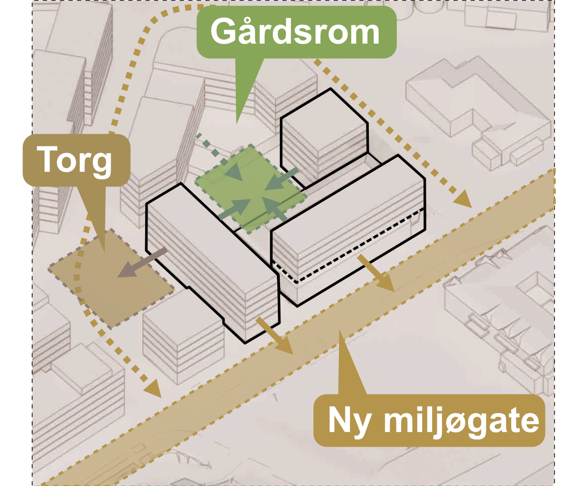 En omfordeling av arealene muliggjør en bærekraftig, gjennomførbar og fleksibel utviklingsstrategi. Et grep som styrker sentrumsplanens ambisjoner og skaper tydlige byrom med en styrket kvartalstruktur.