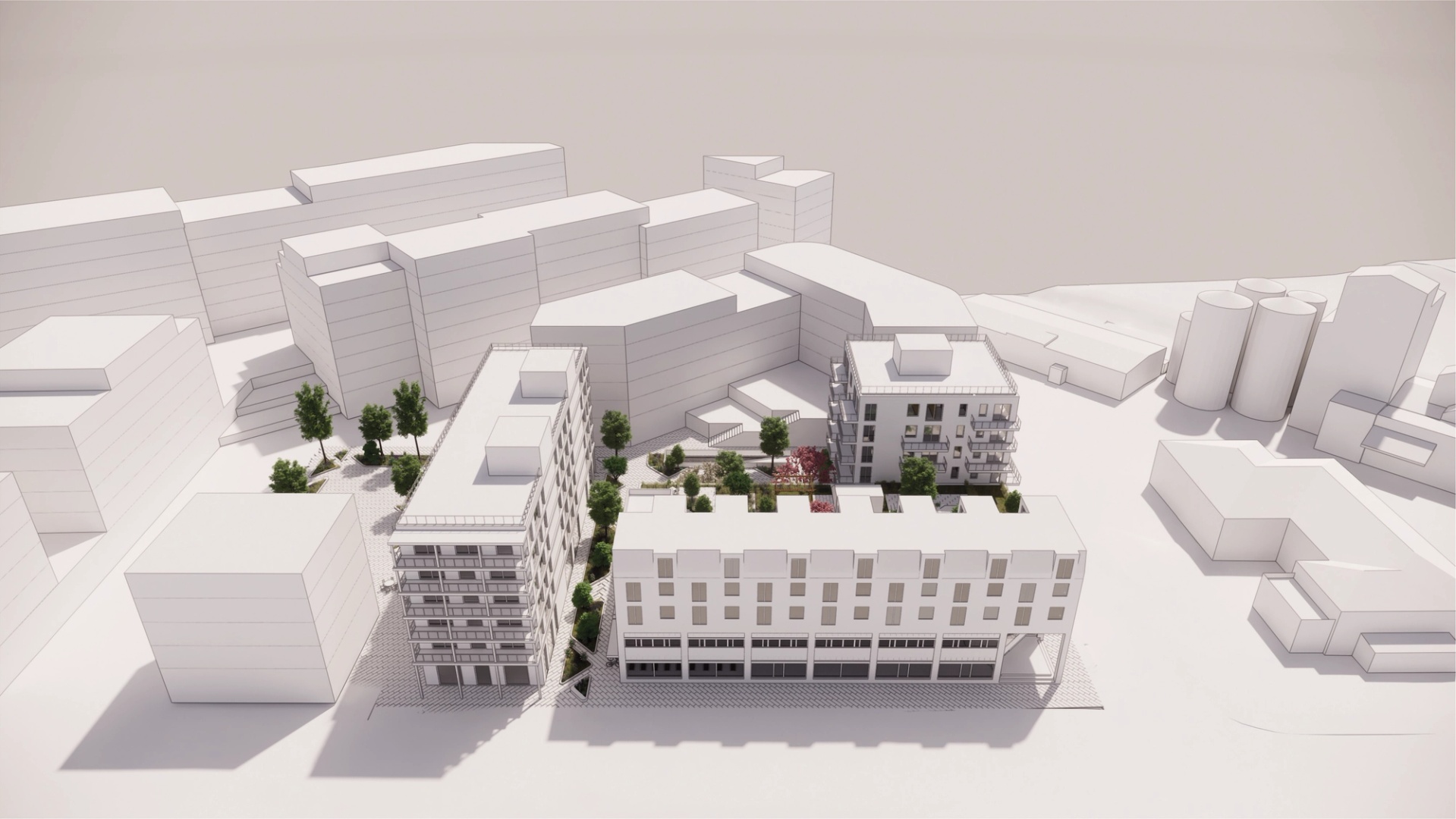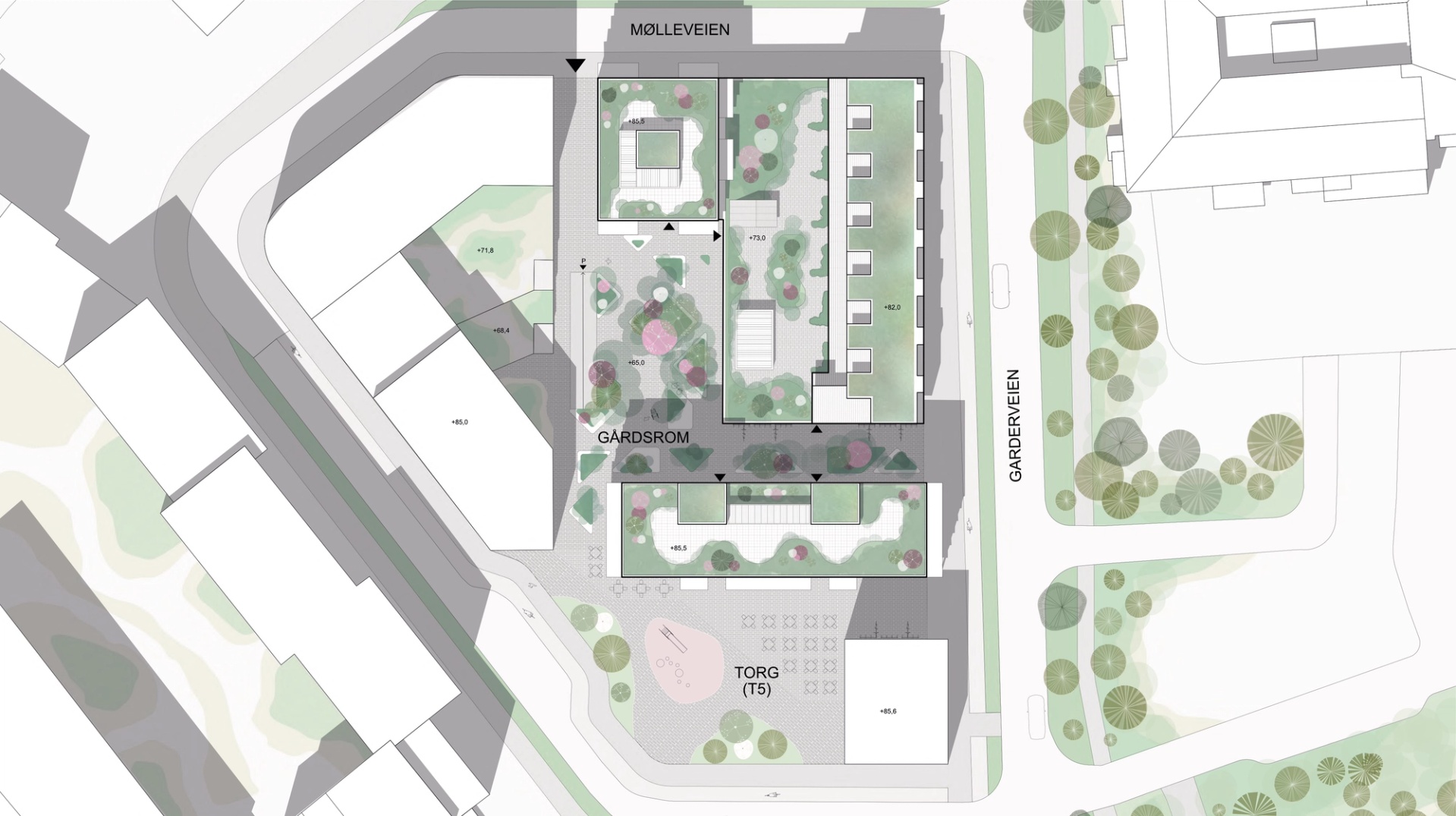 En oppdeling av arealene i flere volum, gir en variert og nedskalert bebyggelse samtidig som det legges tilrette for en variasjon i arkitektonisk uttrykk innenfor kvartalet.