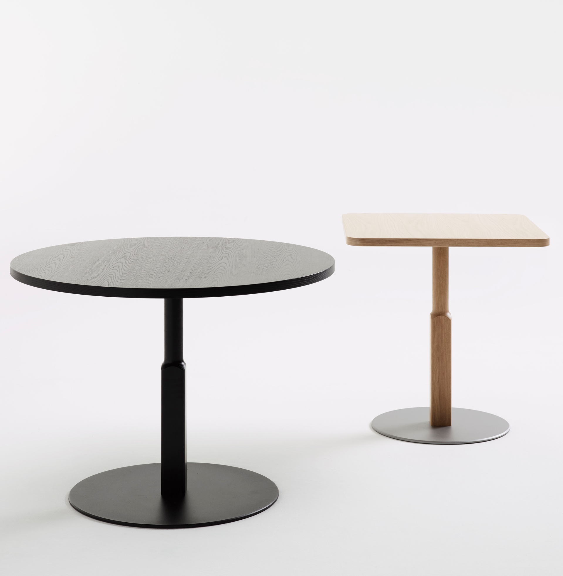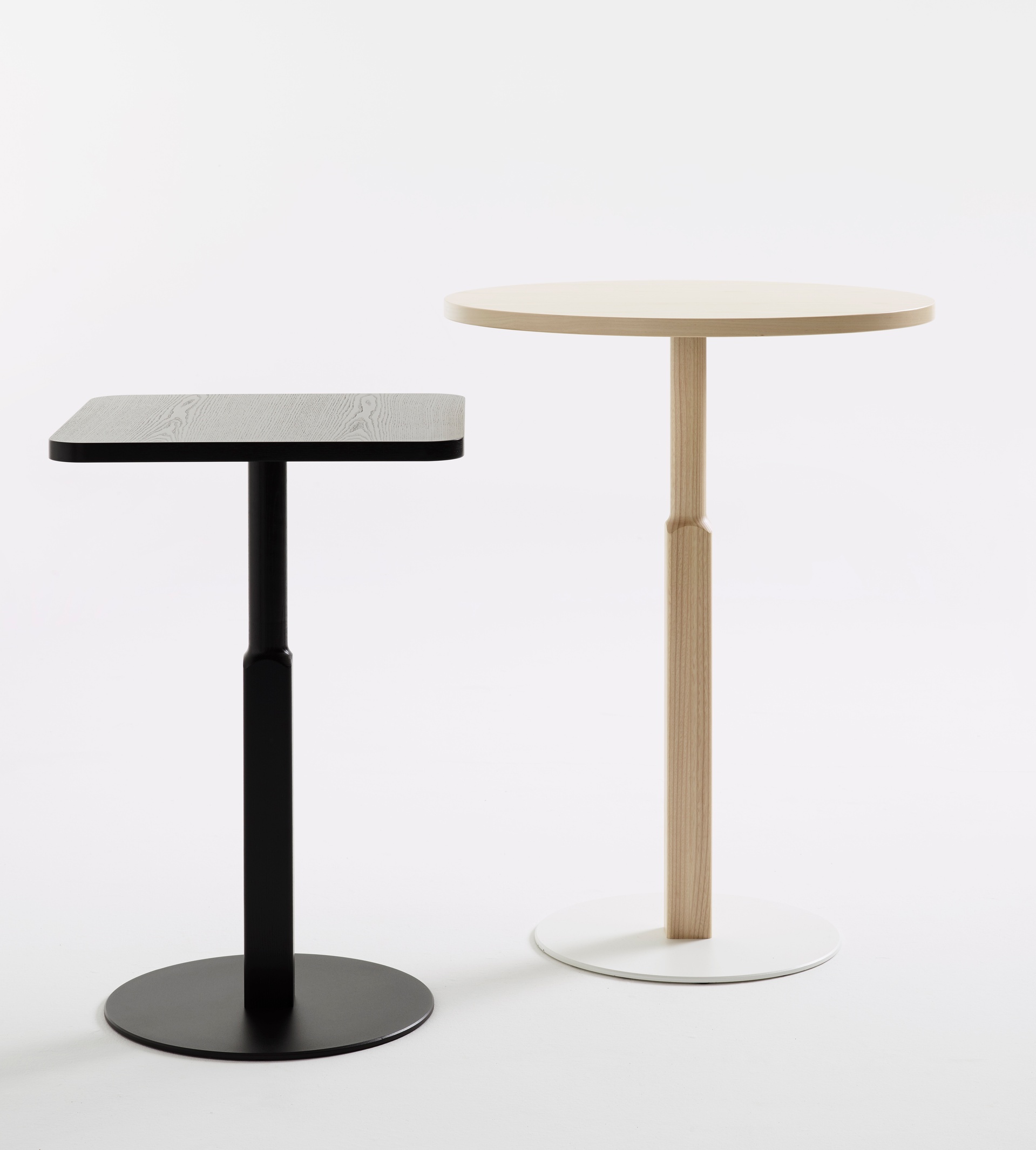 Pelarbordet Woodwork finns i höjderna 730, 900 och 1050 mm, och kan fås med rektangulära, kvadratiska eller runda skivor i fanerad MDF. Pelaren är tillverkad i massiv trä med en stålkärna, och fotplattan är i metall med möjligheten till pulverlackering i olika färger. Eluttag finns som tillbehör till det rektangulära bordet.