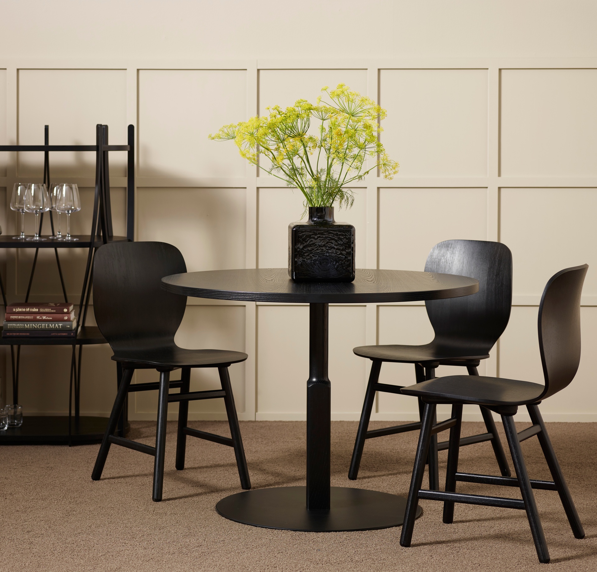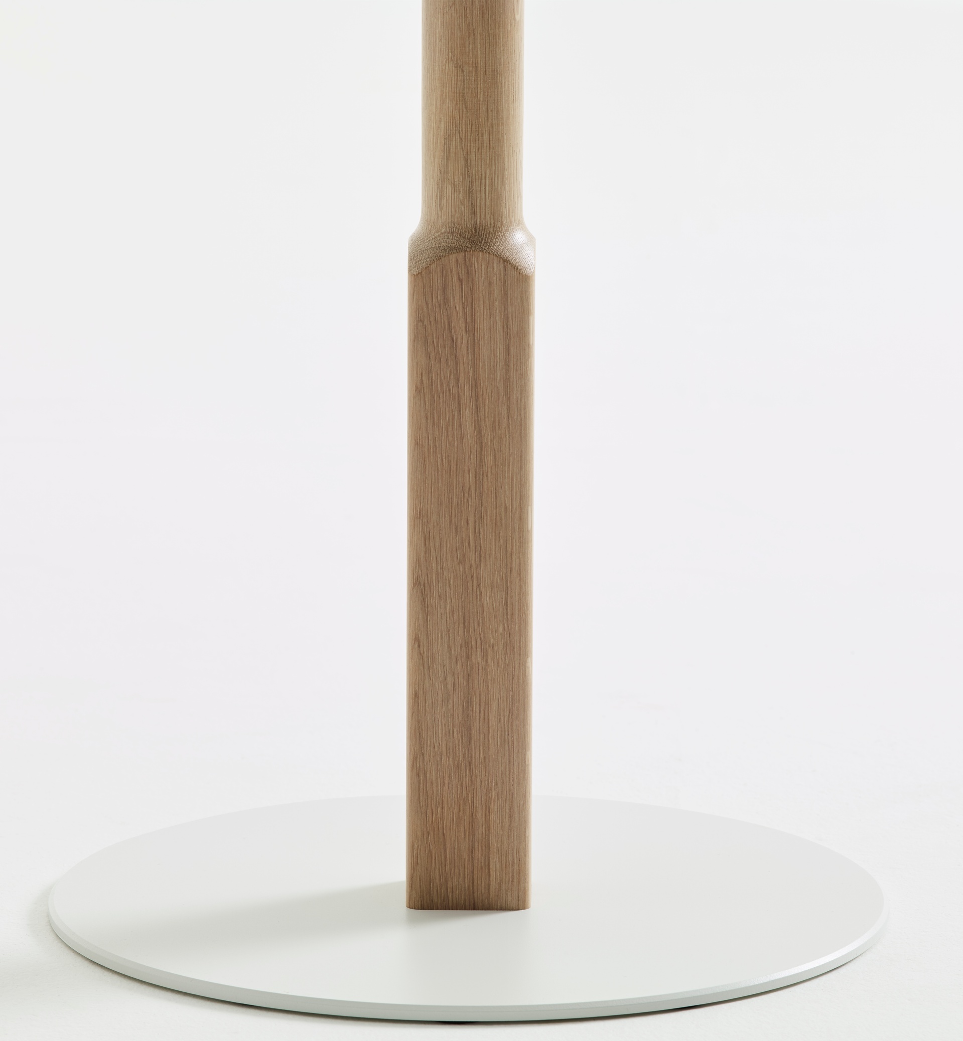 Bordets ben har ett genomtänkt detaljarbete, där den övre runda delen övergår i en fyrkantig form för att minimera risken att slå i knäna när man sitter vid eller rör sig kring bordet.